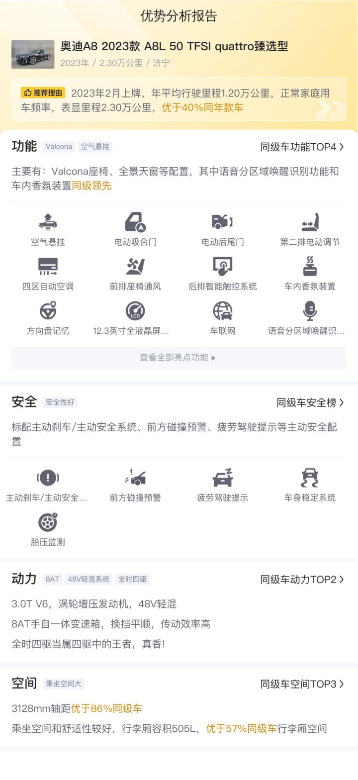 说七说八,奥迪A8 2023款 A8L 50 TFSI quattro臻选型功能竖立在同级别车型中处于跳跃地位,尤其是安全竖立,优于80%同级车,其空间推崇也属于同级别车型中的杰出人物。本车售价58.8万,低于市集行情价,是一个可以的采纳。需要细心的是,本车有过一次过户纪录,购买前需要充分了解车况。