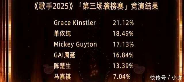 进程强烈的角逐,本期歌手的排名尘埃落定:Grace Kinstler 荣登榜首,单依纯紧随自后位列第二,Mickey Guyton 位居第三,Gai 还是稳守第四,陈楚生位列第五,马嘉祺排名第六,而白举纲则缺憾垫底。