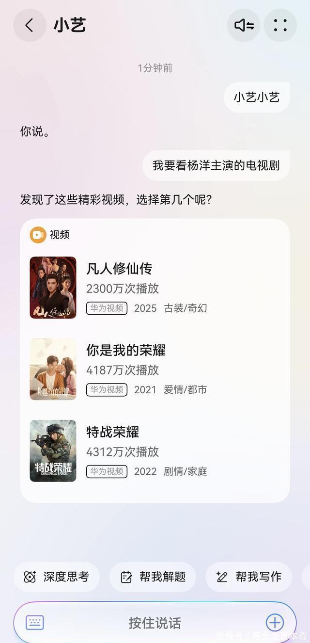 我可简直气运爆棚!居然领到了优酷会员月卡,随机不错畅追《凡东说念主修仙传》。最近对“杨洋”很上面,趁着这几天停更,思追他主演的其他电视剧缓解我等更新的心焦,但不了解他演了啥剧。思起华为视频的【AI影视万能搜】,我对入部下手机喊:“小艺小艺,我要看杨洋主演的电视剧。”立即给我保举了视频播放卡片,点击我方思看的可径直跳转到华为视频看,这功能可太懂咱剧迷的心了,几乎是追剧神器!