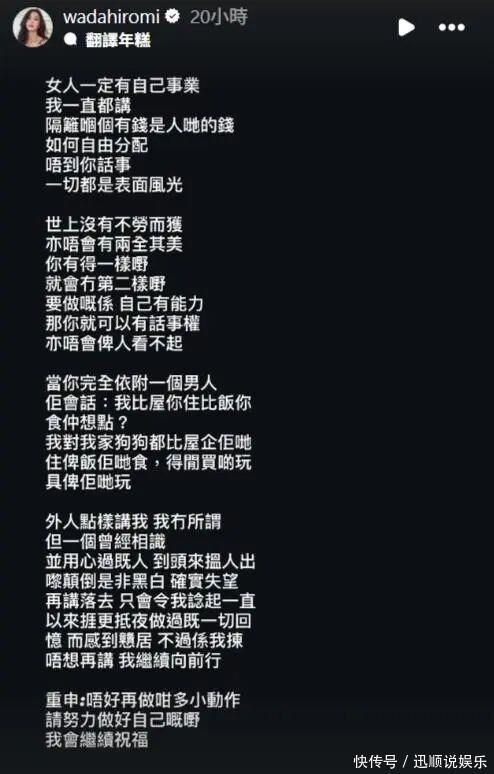 裕好意思昨天莫得现身记者会,但过后在酬酢平台发文复兴事件。她说:“女东说念主一定要有我方的做事。我一直王人说,隔邻阿谁有钱是别东说念主的钱,如何目田分派,轮不到你作念主,一切王人是名义情景。世上莫得不劳而获,也不会有两全其好意思。你获取雷同东西,就会失去另雷同东西。