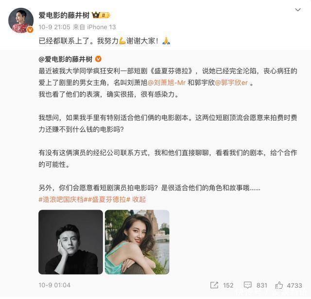 值得精通的是,刘萧旭不仅收货诸多不雅众的醉心,还受到不少内娱从业东说念主员的醉心,比如有名电影制片东说念主藤井树。 在《盛夏芬德拉》爆火之后,她发文默示“想要和刘萧旭和郭宇欣聊聊,望望咱们的脚本”。据悉,现在她仍是与刘萧旭得到了相关。