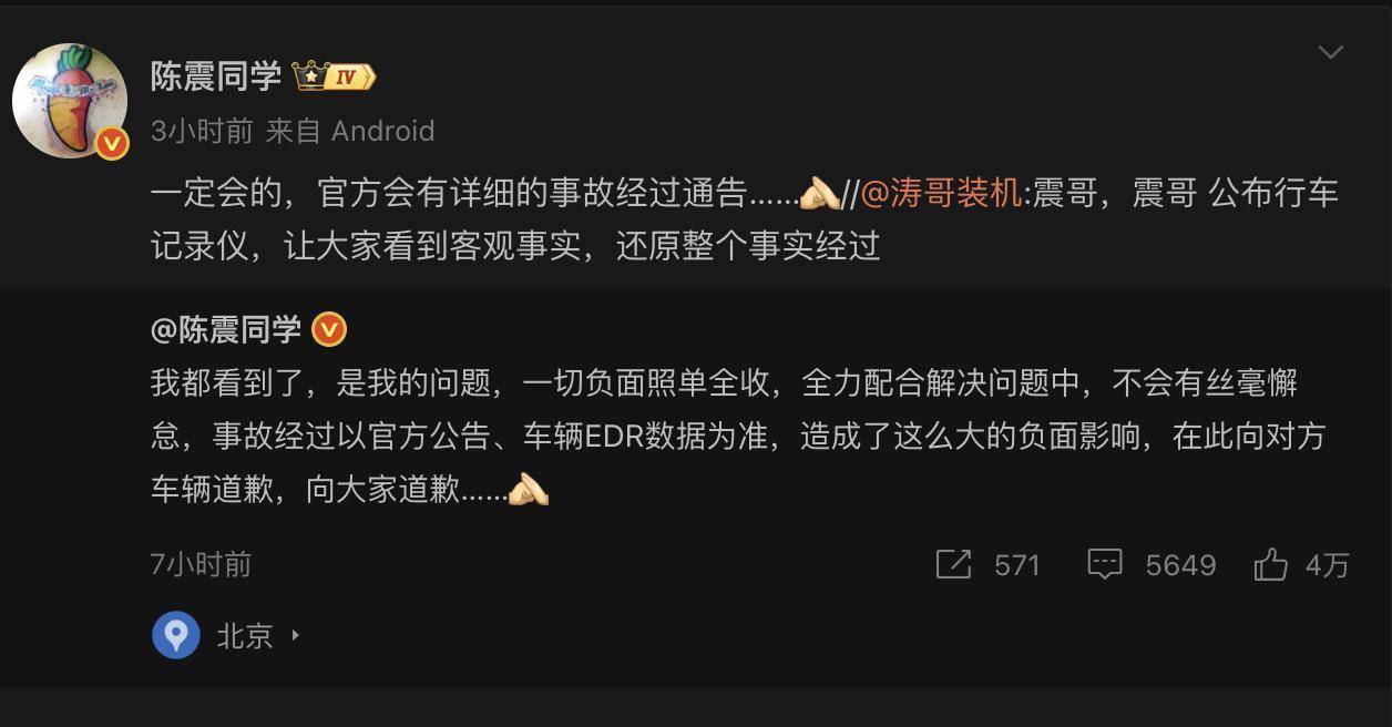 当日下昼3时许,陈震发文说念歉称:我王人看到了,是我的问题,一切负面照单全收,全力和洽责罚问题中,不会有涓滴懈怠,事故流程以官方公告、车辆EDR数据为准,形成了这样大的负面影响,在此向对方车辆说念歉,向行家景歉……