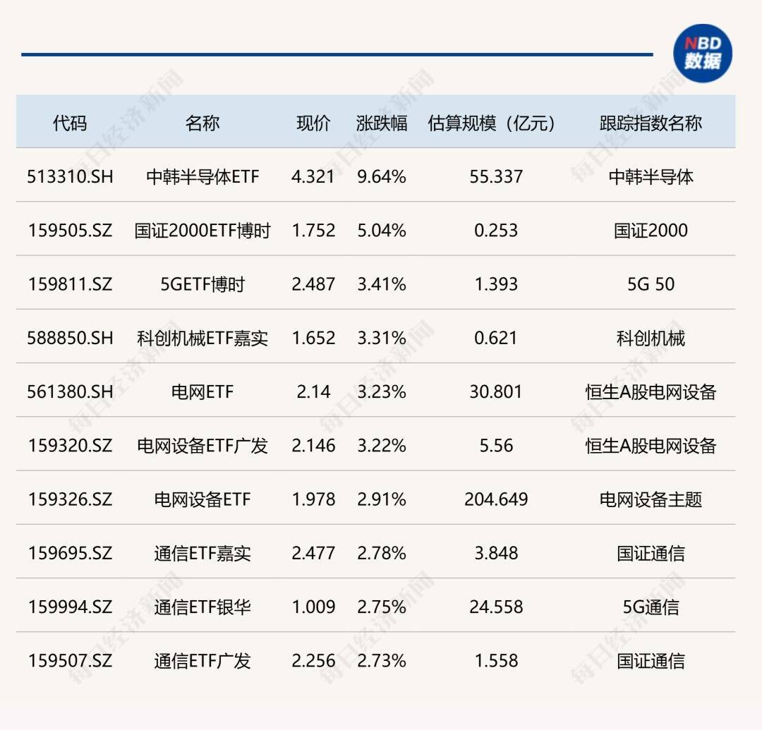 ETF涨跌幅方面,中韩半导体ETF涨超9%,电网设立联系ETF涨约3%。